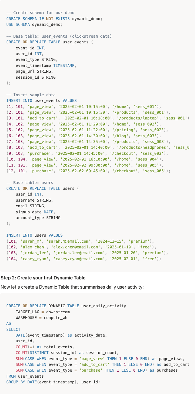 Let's see how Dynamic Tables work with a real-world scenario. Imagine you're building user analytics for a SaaS product. You have clickstream data flowing in, and you need to track user engagement, daily activity, and conversion metrics.